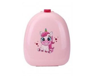 Виготовлений він із міцного та якісного пластику, відмінно зберігає форму, стійкий до ударів та падінь. Яскравий і красивий рюкзак прикрашений милою наліпкою єдиноріжки. Він дуже зручний, має регульовані ремінці, що дозволяє ідеально підлаштувати їхню довжину для діток різного зростання. Пластиковий рюкзак дуже простий у догляді, його не потрібно прати, достатньо протерти вологою ганчірочкою зовні та всередині. Дощ і сніг йому теж не страшні – аксесуар досить герметичний і його вміст залишиться сухим та у відмінному стані. У рюкзаку легко розміститься ланч бокс з корисним перекушуванням, розмальовка, олівці, улюблений ведмедик та різні іграшки. У ньому достатньо місця для рукавичок, шапки та змінного одягу.